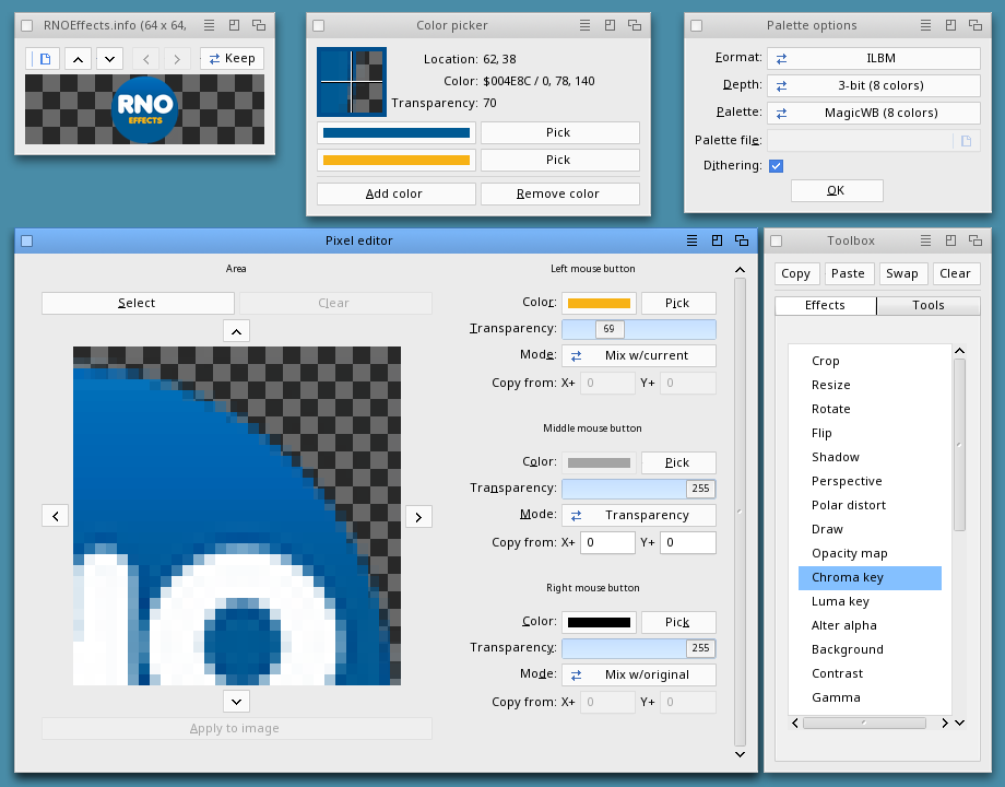 conversion options, alpha channel based effects, and pixel editing. It offers