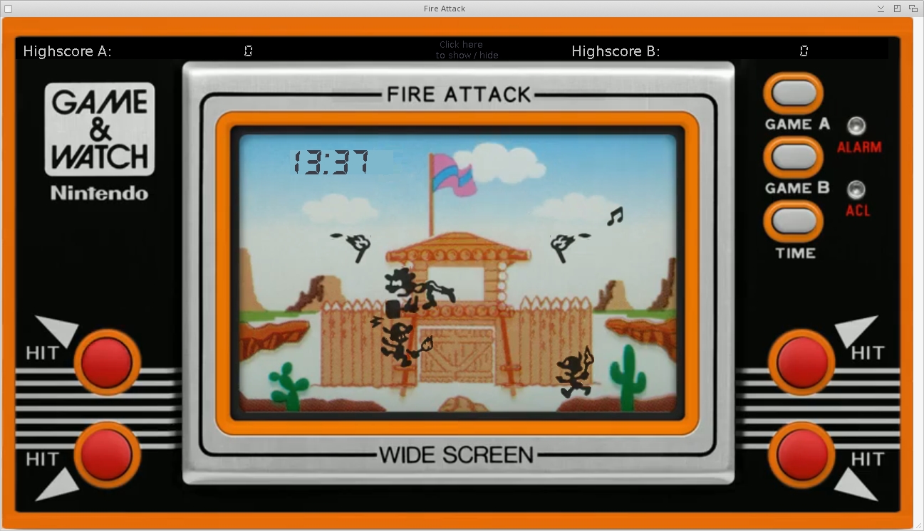 Fire Attack is a remake of the LCD game made by Nintendo. The pupose of the game is to prevent the attackers to set the fort on fire. To do this the cowboy must use his hammer to hit the torches or the attackers in time.