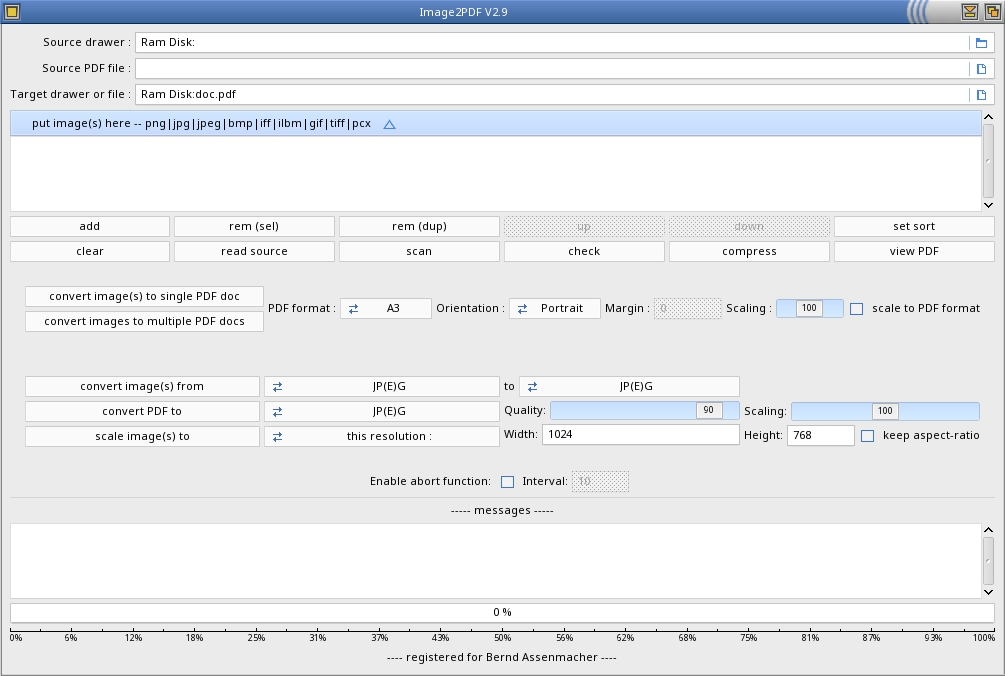 13th January 2024 --- V2.5 - rearranged GUI to make it more intuitive - melted the target requesters to one single target requester - added source PDF-file requester to GUI for PDF2Image and PDF2PDF - added function "Image2Image" to change the format of images - added function "scan file(s)" to determine the attributes of the image(s) - added function "rem (dup)" to remove duplicate entries from the listview - added function "check" to check the given images if they are valid to process and to clean the listview from unvalid image files - added possibility to scale images to a fixed size - added more formats for Image2PDF (B4, B5, US, Executive, Comm10) - installer now sets the OS automatically (thanks Daniel ;-)) - key F1 now opens the guide file as help too - updated tooltips - optimized output messages - fixed a bug where "read source" did not work correctly sometimes. - many improvements done "under the hood" ... ;-)