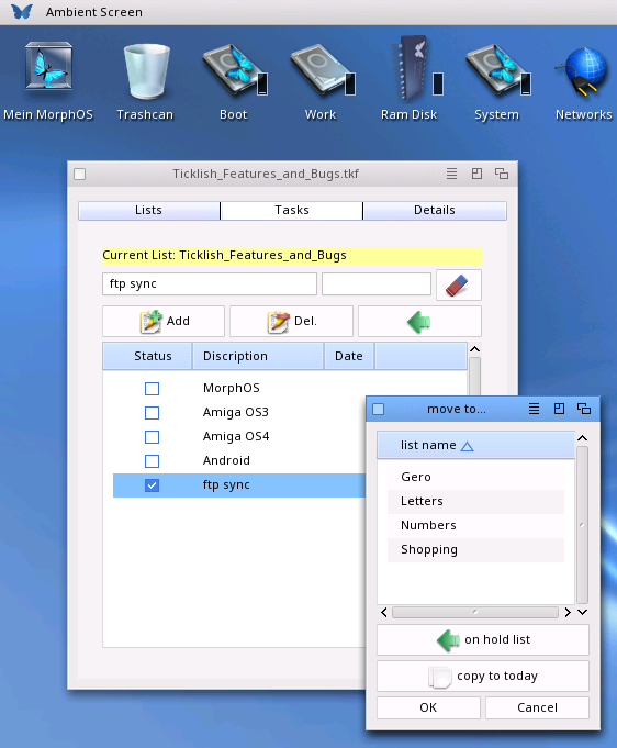 -------------------------------------------------------------------------- What is it? -------------------------------------------------------------------------- Ticklish is a simple ToDo List tool. Including subitems/steps and notes for each ToDo item. Due Dates and moving items from on to another List ist also supported. You can either store todo lists locally or keep them in sync with an online ftp server. It is aimed to run on different architectures (Amiga OS4, Windows, Android, Amiga OS3, MorphOS, Linux). This archive contains a MorphOS3.x ppc build.